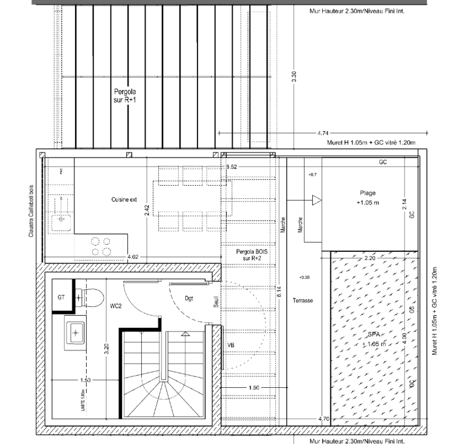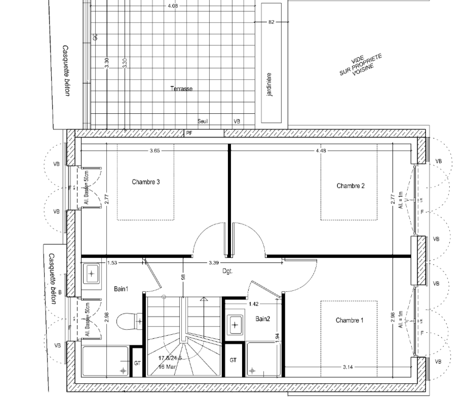Premier étage : - Trois chambres. - Deux salles de bains. - Deuxième terrasse équipée d'une jardinière et d'une pergola, préservant l'intimité.