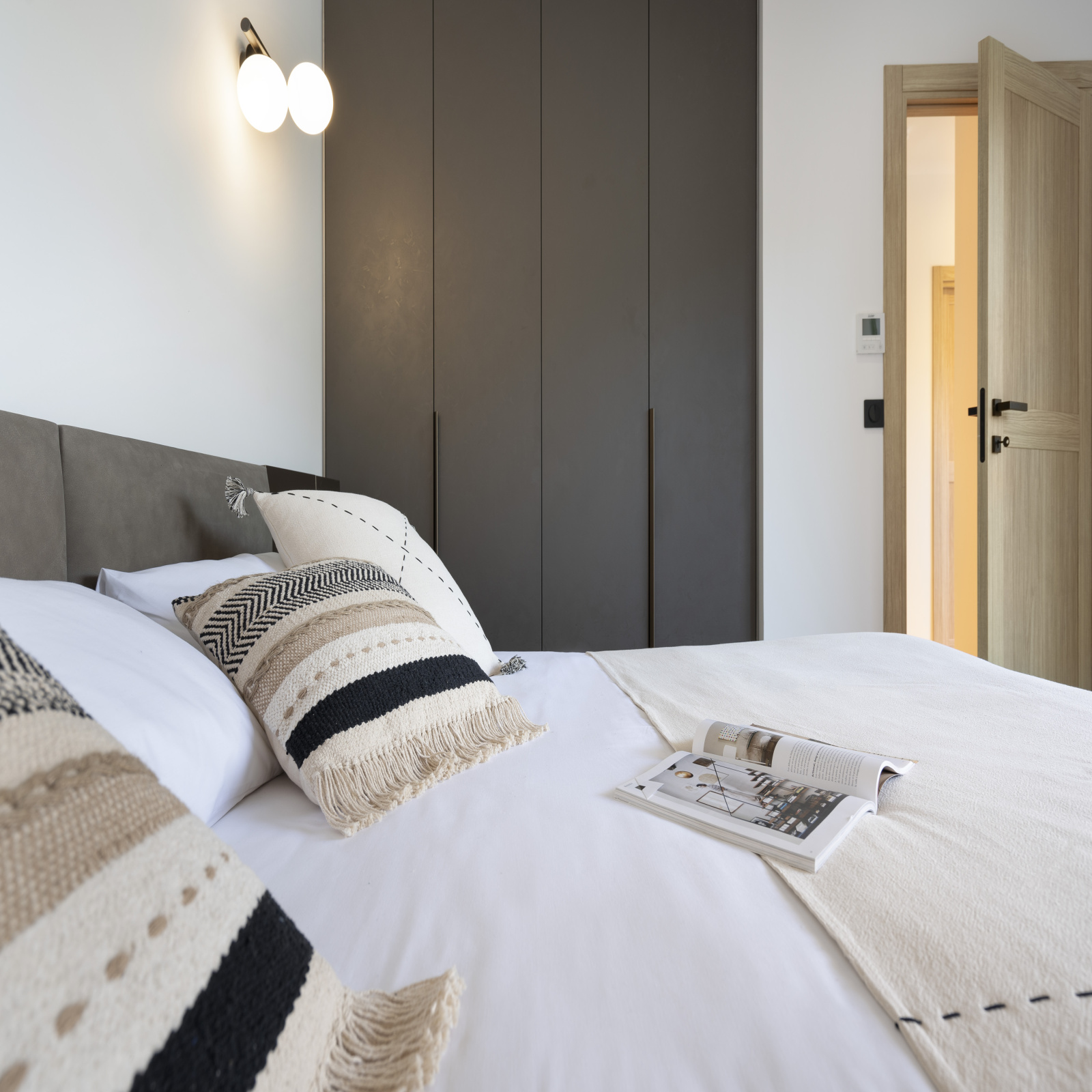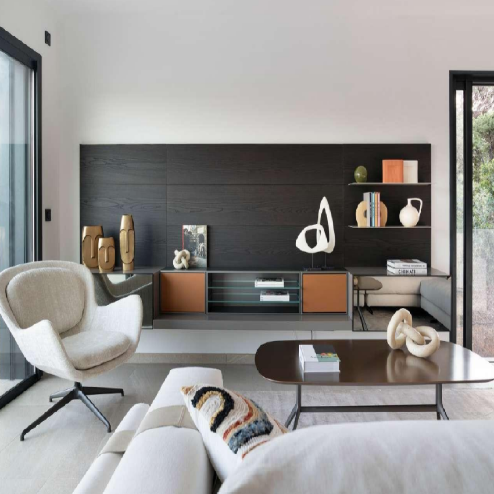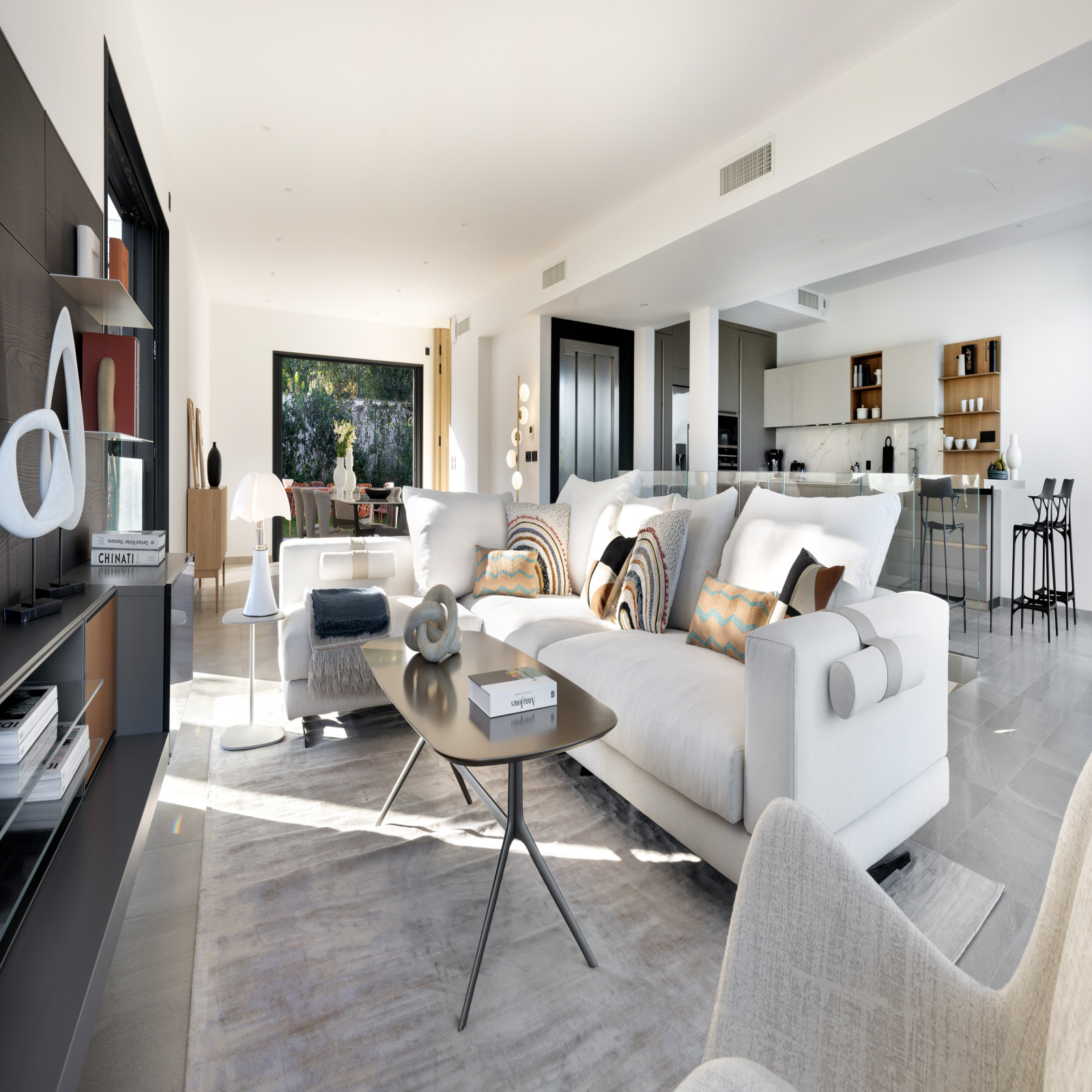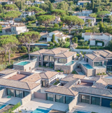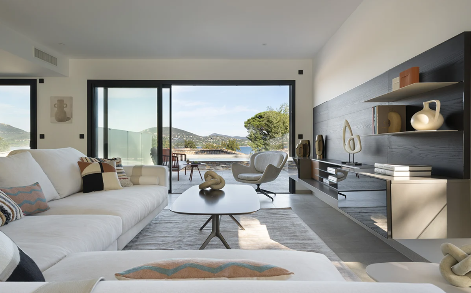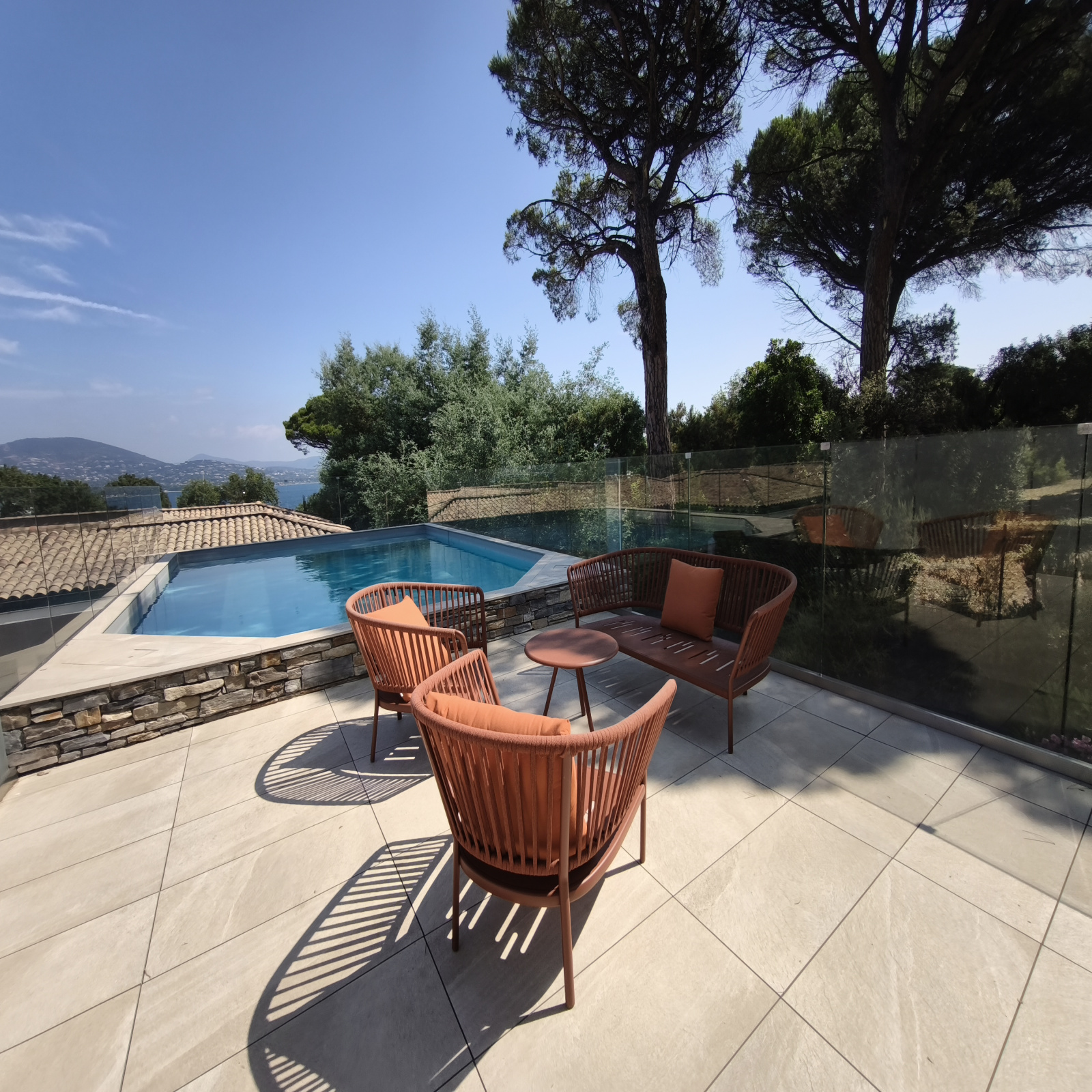 Au premier étage, la pièce principale de plus de 90 m² s’ouvre sur une large terrasse exposée sud. Prolongée par une piscine à débordement, elle offre une vue spectaculaire sur la baie de Saint-Tropez, un véritable tableau vivant à chaque heure du jour.