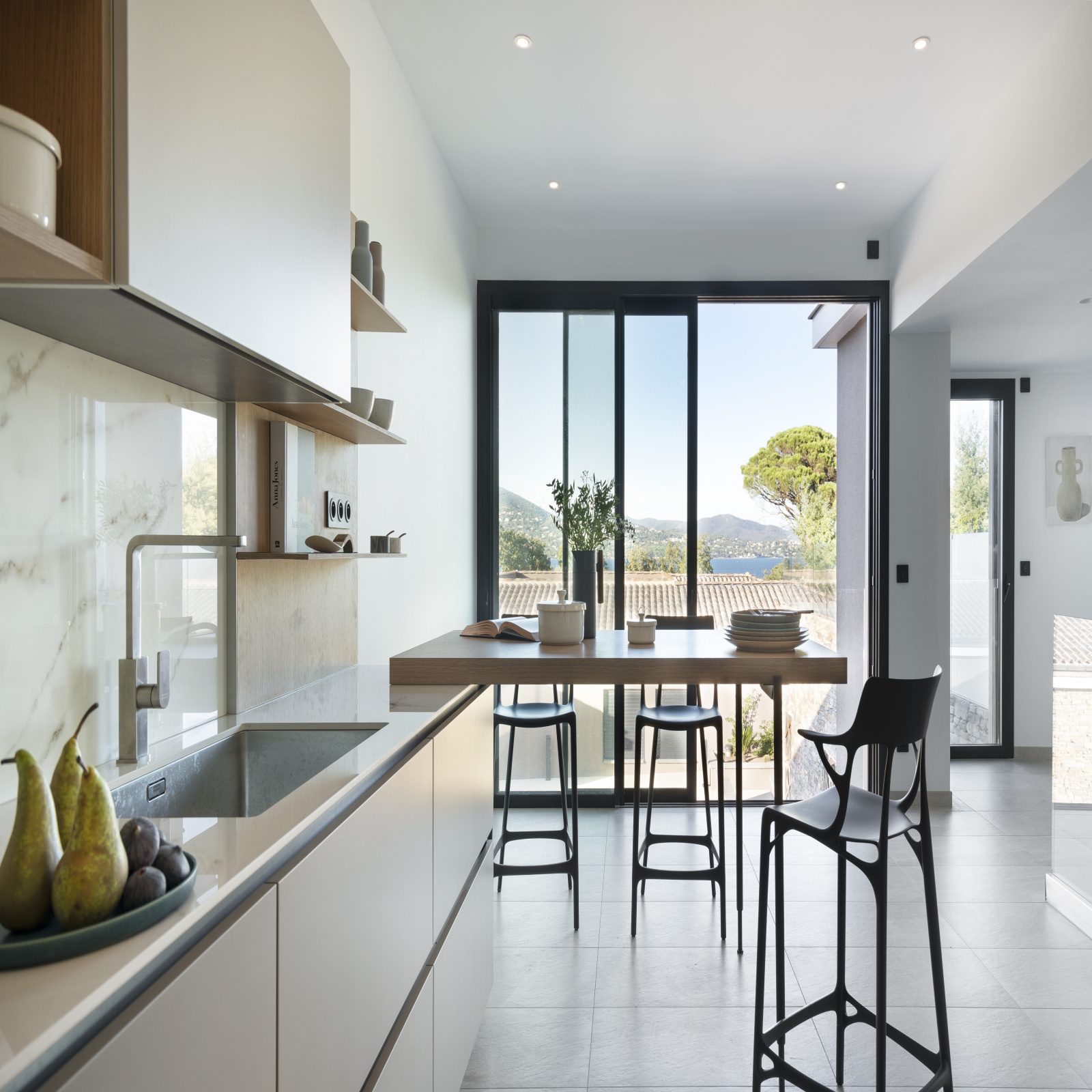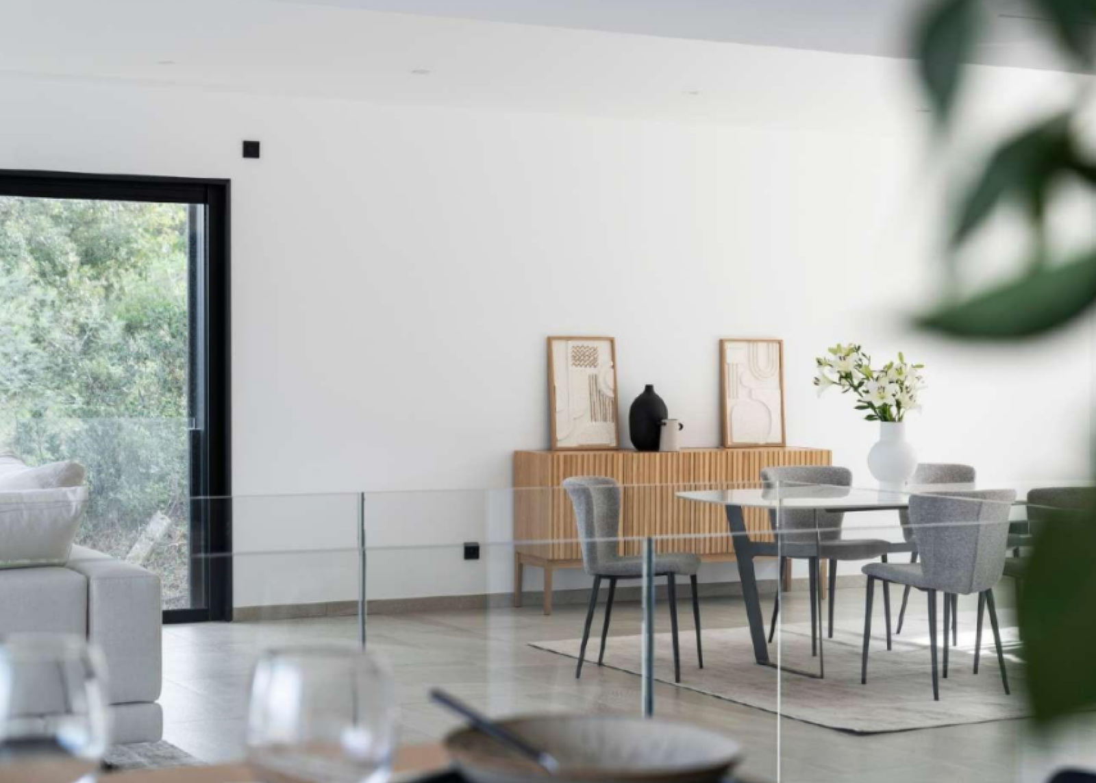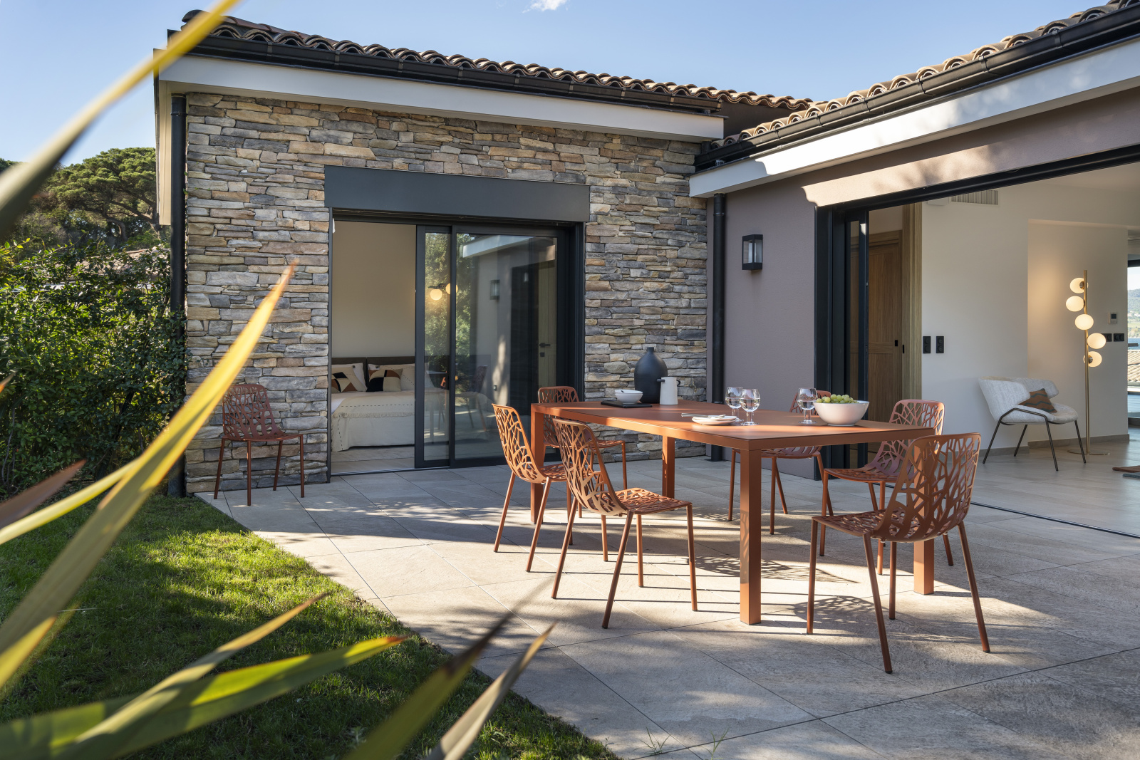 D’une surface habitable de plus de 250 m², cette villa à l’architecture provençale contemporaine se déploie sur deux niveaux. Les matériaux ont été soigneusement sélectionnés : murs en pierre aux teintes locales, enduits à la chaux, serrurerie en inox et teck, et carrelage en grès cérame pleine masse (40 x 90 cm).