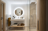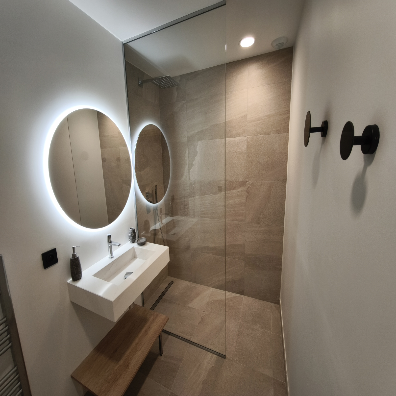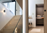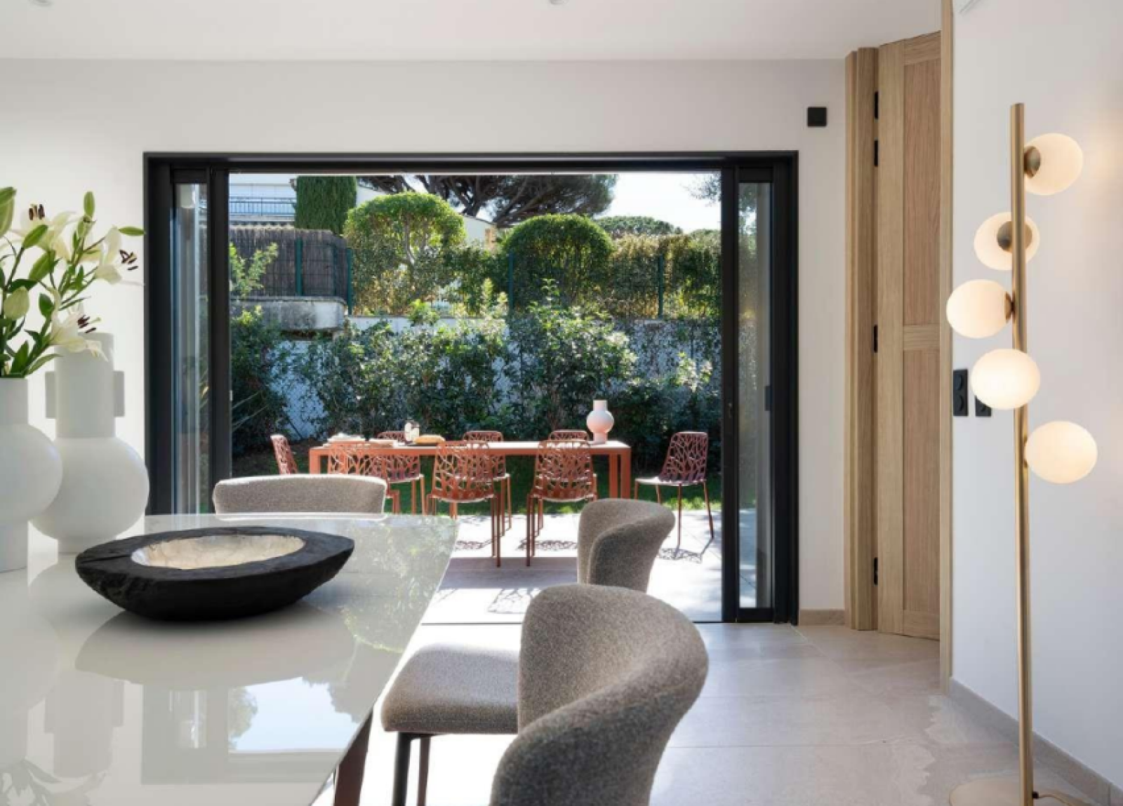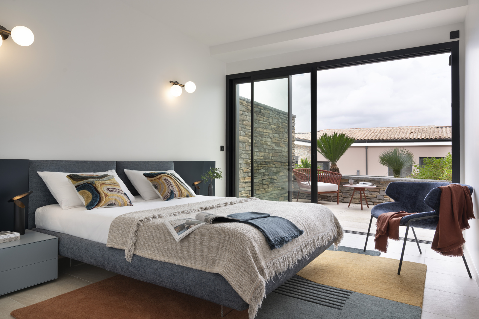 D’une surface habitable de plus de 250 m², cette villa à l’architecture provençale contemporaine se déploie sur deux niveaux. Les matériaux ont été soigneusement sélectionnés : murs en pierre aux teintes locales, enduits à la chaux, serrurerie en inox et teck, et carrelage en grès cérame pleine masse (40 x 90 cm).