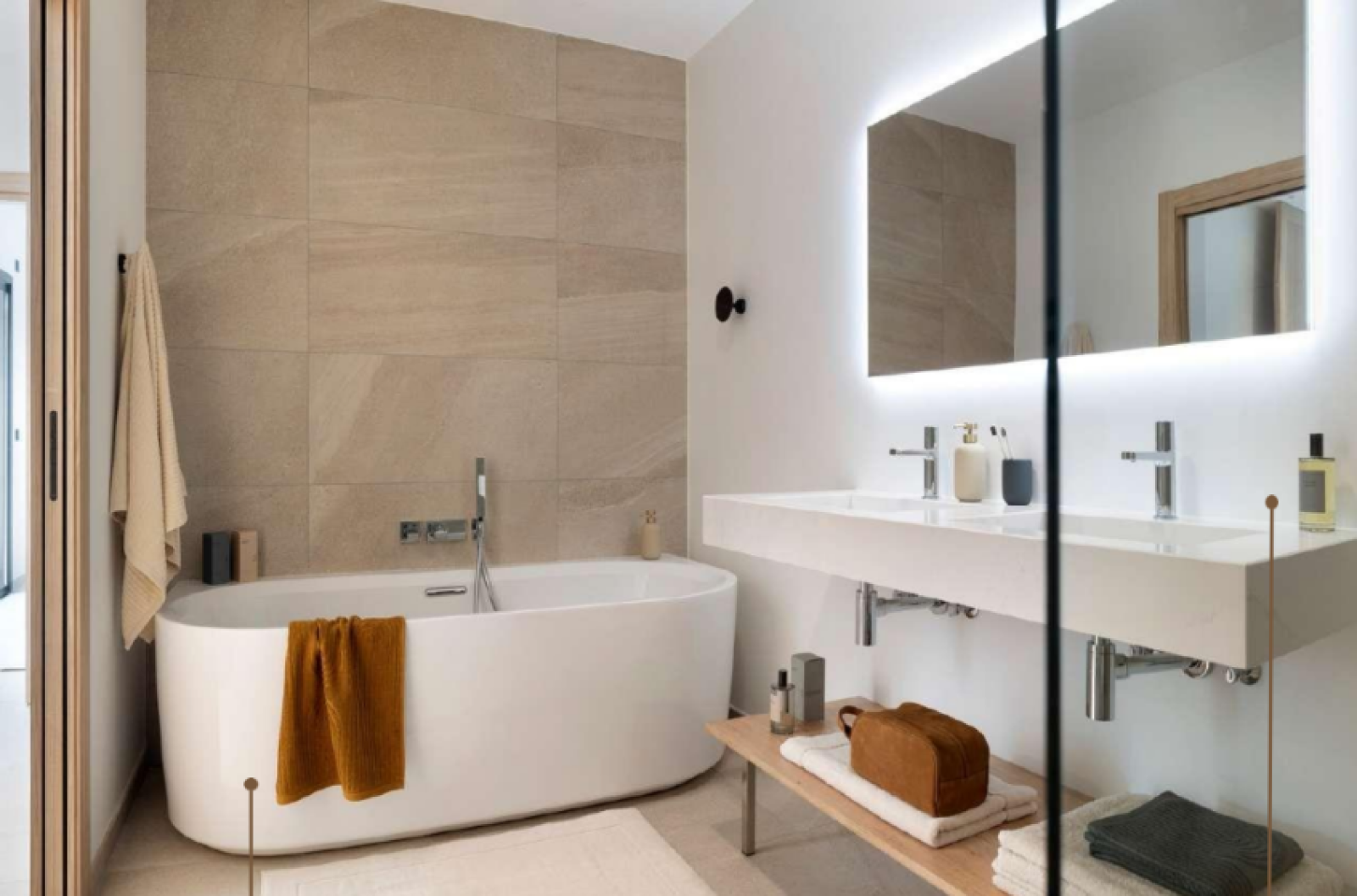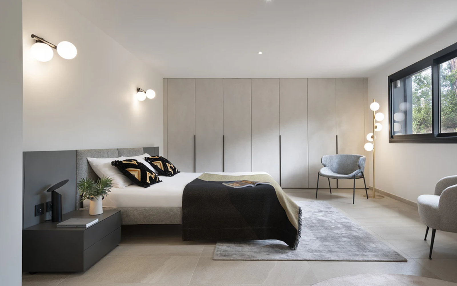 La villa dispose de quatre chambres en suite, d’un sous-sol de plus de 100 m² avec garage privé accessible par ascenseur à voiture, d’un ascenseur intérieur, d’un portail motorisé sécurisé, de brise-soleils motorisés et d’une gestion domotique complète.