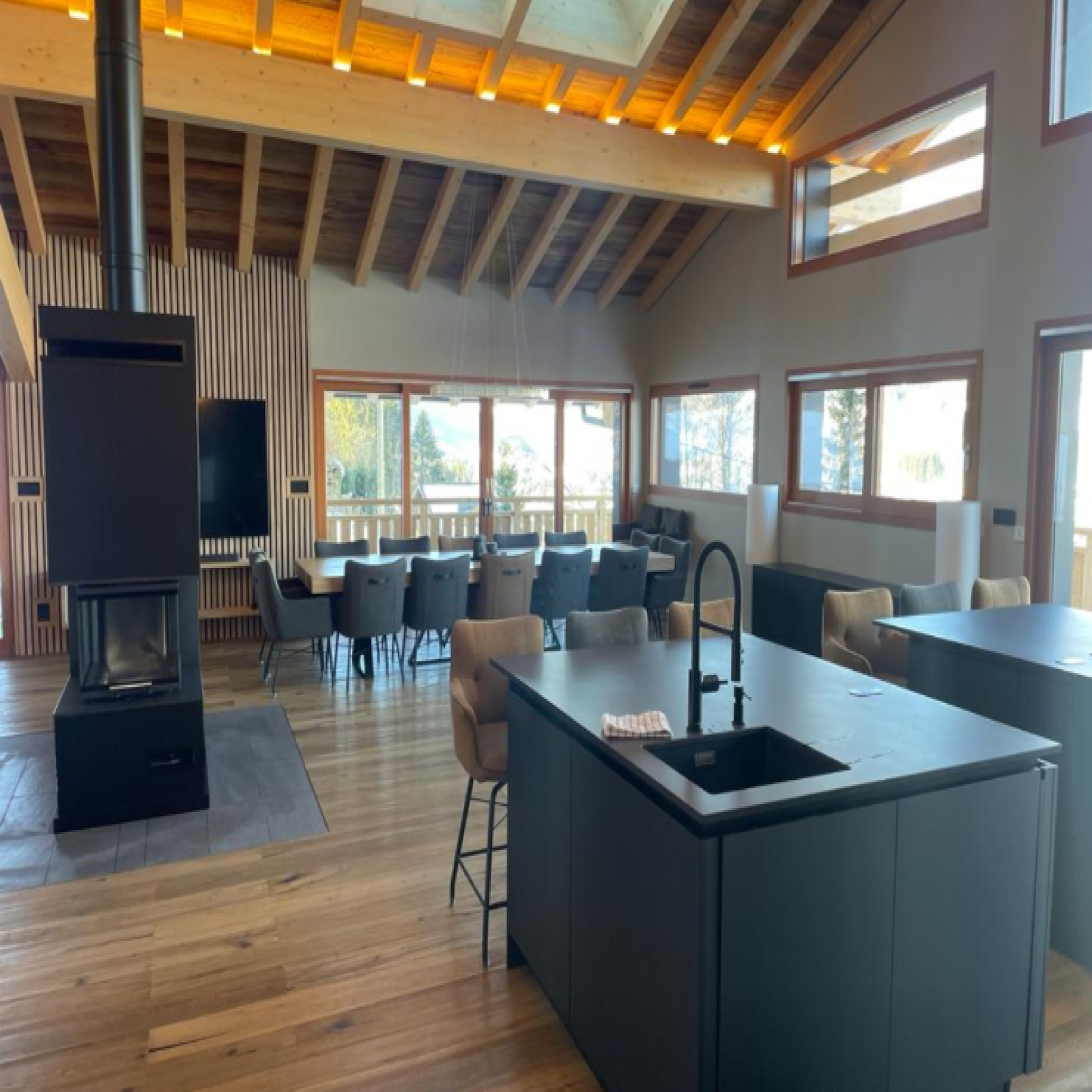 Cuisine équipée, séjour avec cheminée bois pour une ambiance chaleureuse